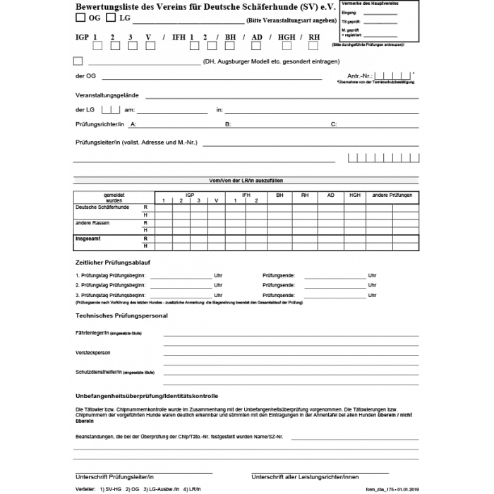 Jeweils eine weitere Ausfertigung erhält der Richter und die ausrichtende OG zur Archivierung. Zur Meldung der Prüfungsdaten an den Hauptverein nur gültig in Verbindung mit der Bewertungsliste "Zusatzblatt".