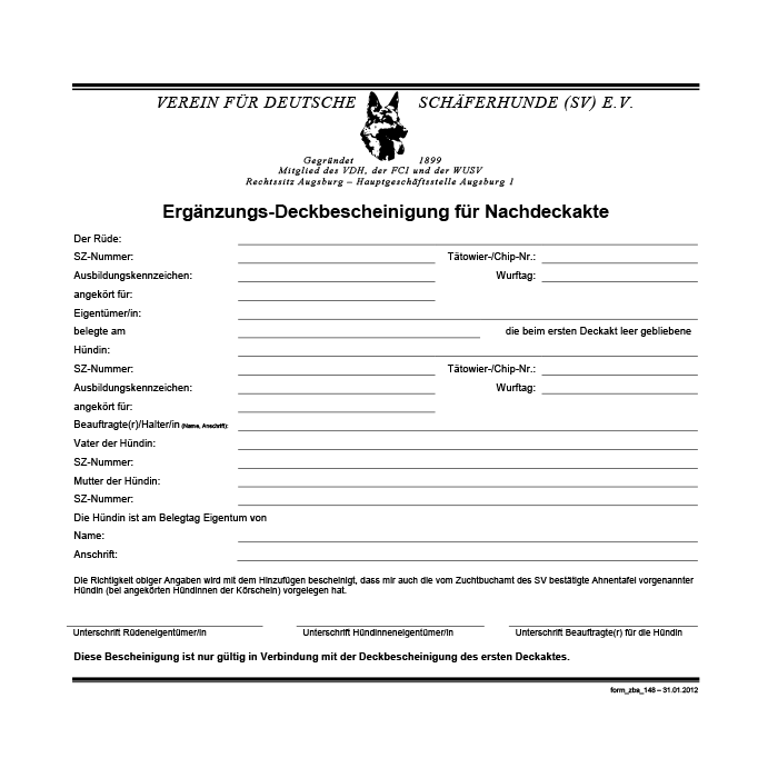 Die Original-Nachdeckbescheinigung muss mit den Wurfunterlagen eingereicht werden, der Durchschlag bleibt im Besitz des Rüdeneigentümers.
