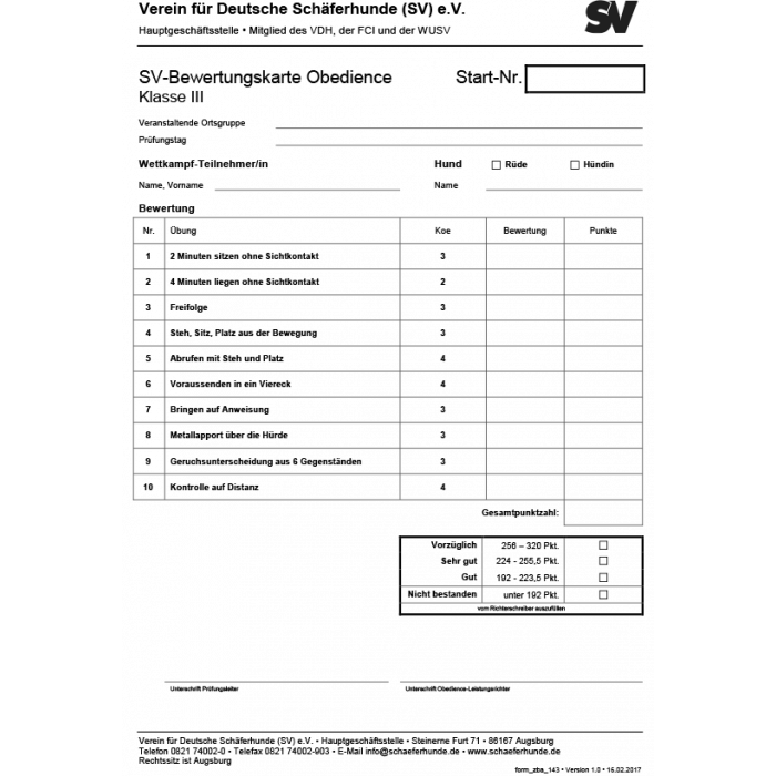 Für Richter zur Dokumentation der Leistung des Hundes bei der genannten Prüfungsstufe.