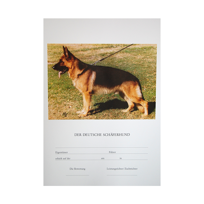 Urkunde zur Bestätigung der Teilnahme an einer Prüfungsveranstaltung oder Schau mit Eintragung der Bewertung.